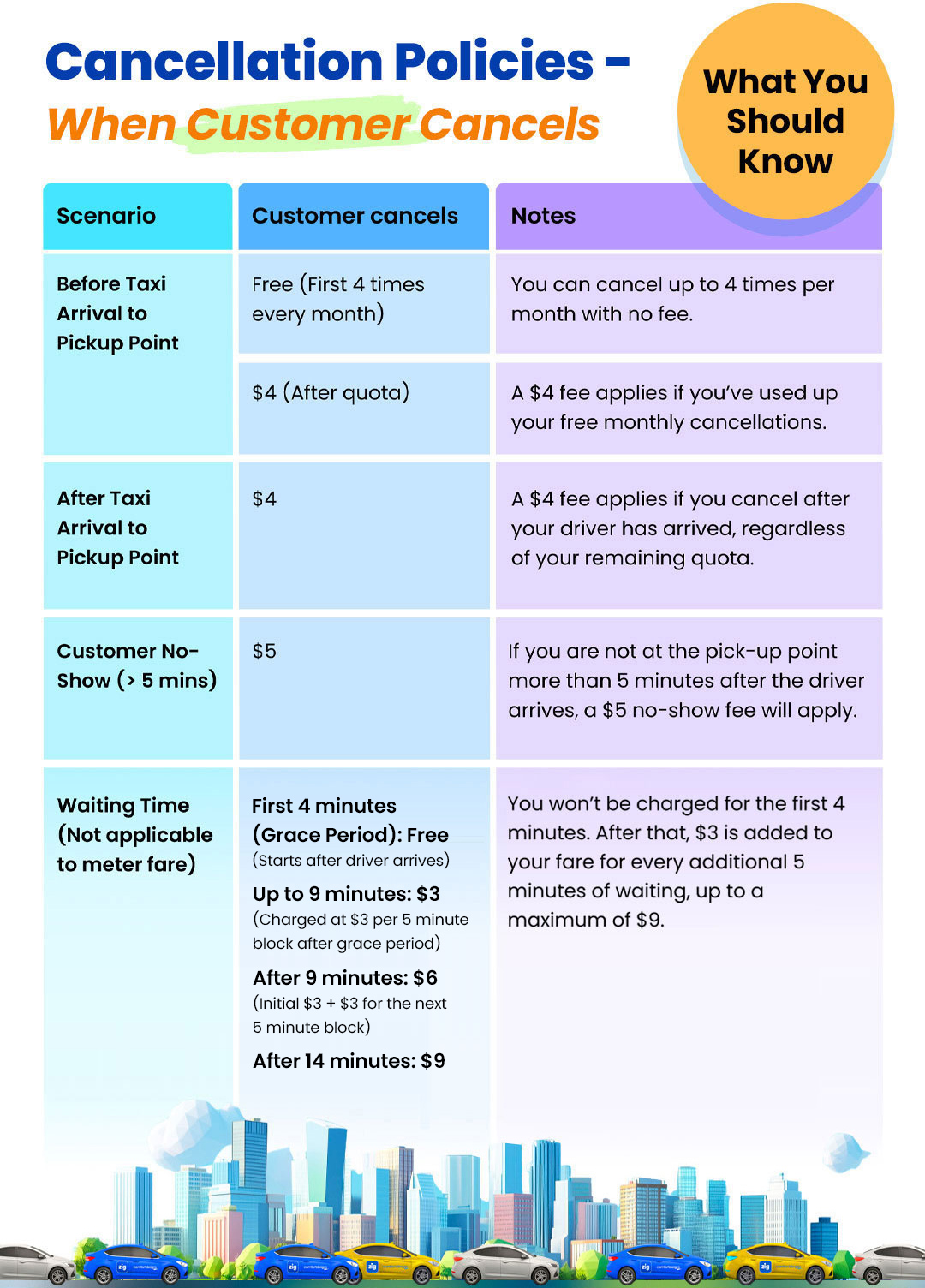 A cancellation fee of $4 will be incurred if you cancel a trip after the driver has arrived at the pickup point.