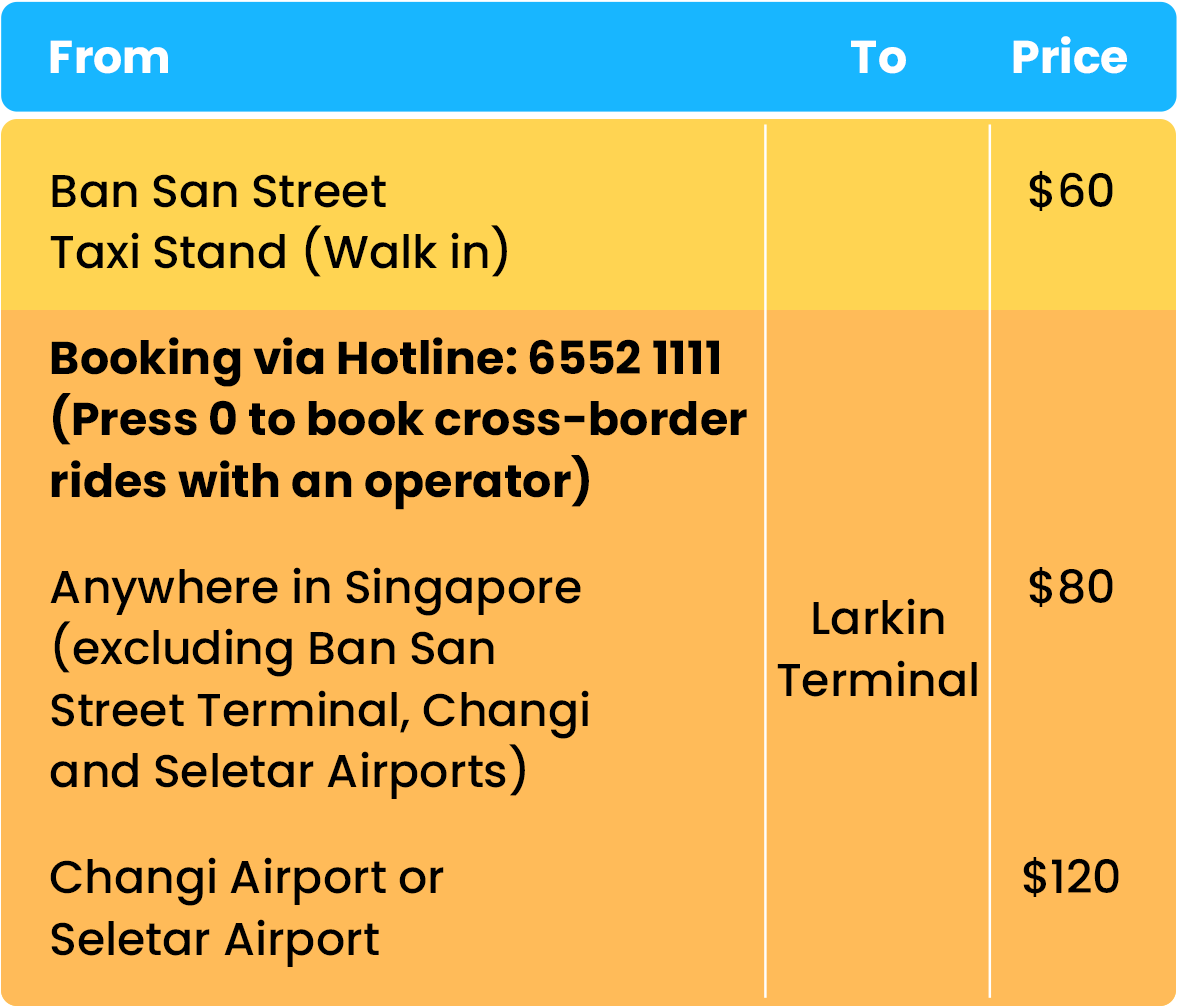 This is a flat fare from Point A (in SG) to JB (Larkin), with no extra charges and stops.