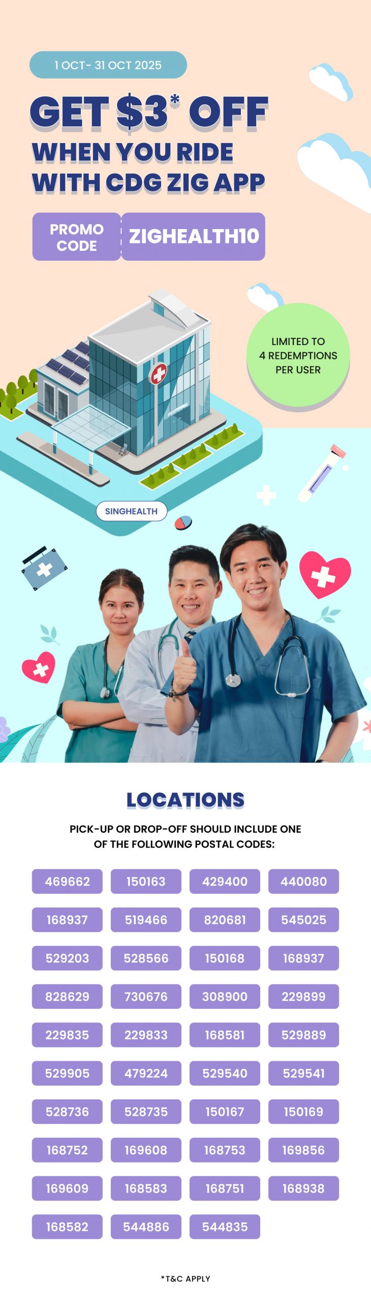 Simply enter promo code [ZIGHEALTH10] to enjoy $3 off your ride booked via CDG Zig App to and from the listed locations, such as SGH, SingHealth Community Hospitals, and Sengkang General Hospital.